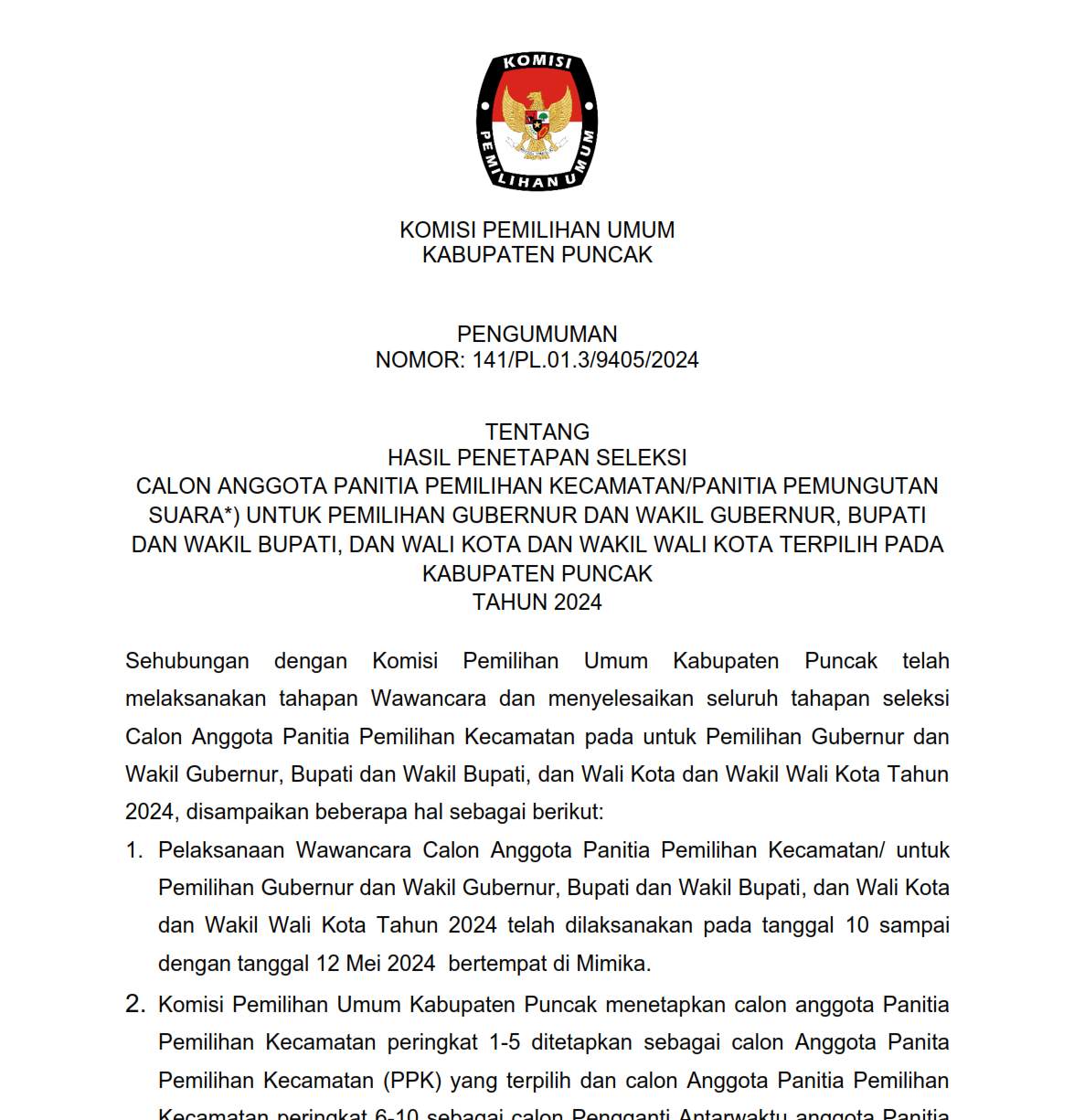 Hasil Seleksi Panitia Pemilihan Distrik (PPD) untuk Pemilihan Kepala Daerah Serentak Tahun 2024 di Kabupaten Puncak