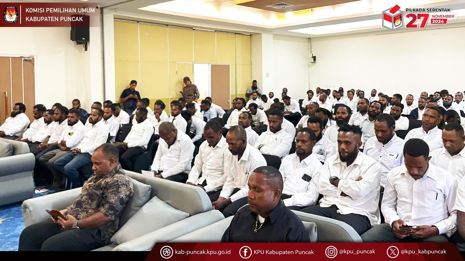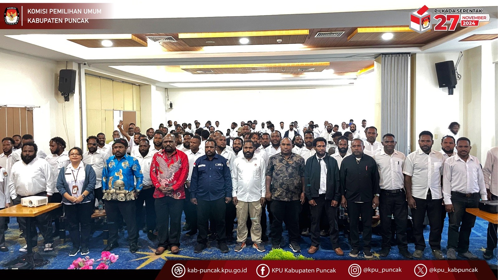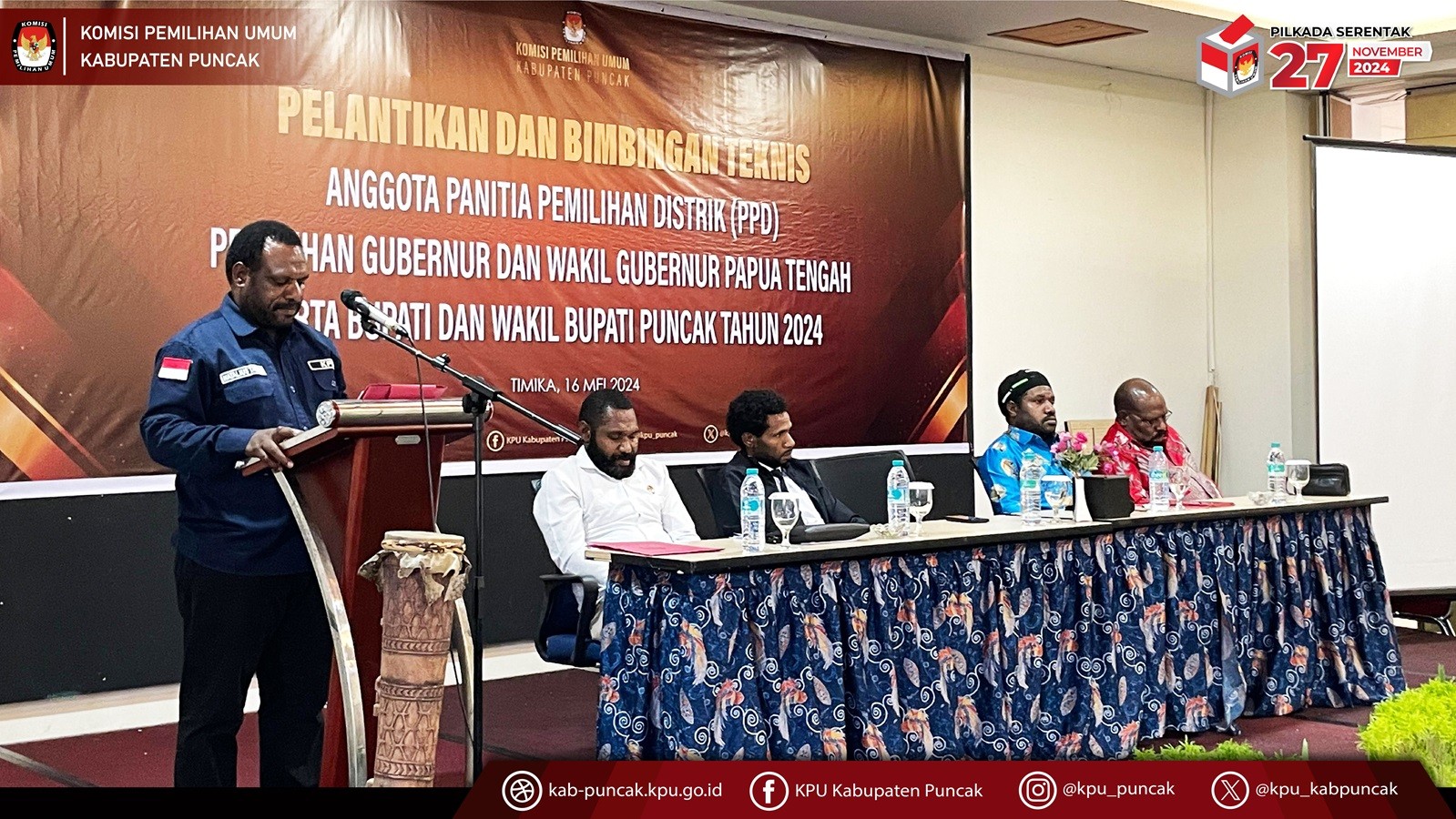 Kamis, 16 mei 2024, Komisi Pemilihan Umum Kabupaten Puncak telah melantik dan memberikan Bimbingan teknis kepada 125 anggota Panitia Pemilihan Distrik (PPD) dari 25 Distrik/Kecamatan di Kabupaten Puncak untuk pemilihan Kepala Daerah Serentak Tahun 2024. kegiatan ini dihadiri juga oleh Anggota BAWASLU Kabupaten Puncak.