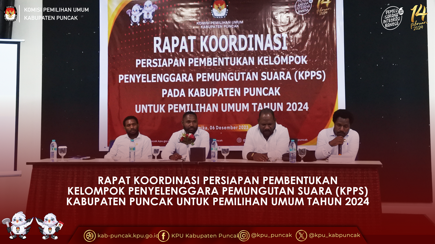 #TemanPemilih, Jadwal Tahapan Pembentukan Kelompok Penyelenggara Pemungutan Suara atau KPPS Pemilihan Umum Tahun 2024 di Kabupaten Puncak akan dilaksanakan berdasarkan Lampiran II Keputusan Komisi Pemilihan Umum nomor 1669 Tahun 2023 tentang Perubahan Ketiga atas Keputusan Komisi Pemilihan Umum Nomor 476 Tahun 2022 tentang Pedoman Teknis Pembentukan Badan Adhoc Penyelenggara Pemilihan Umum dan Pemilihan Gubernur dan Wakil Gubernur, Bupati dan Wakil Bupati, dan Walikota dan Wakil Walikota, sebagai berikut : 1. Pengumuman pendaftaran calon anggota KPPS dimulai tanggal 11 Desember 2023 sampai 15 Desember 2023; 2. Penerimaan pendaftaran calon anggota KPPS mulai tanggal 11 Desember 2023 sampai 20 Desember 2023; 3. Penelitian administrasi calon anggota KPPS tangga 11 Desember 2023 sampai 22 Desember 2023; 4. Pengumuman hasil penelitian administrasi calon anggota KPPS tanggal 23 Desember 2023 sampai 25 Desember 2023; 5. Tanggapan dan masukan masyarakat terhadap calon anggota KPPS tanggal 23 Desember 2023 sampai 28 Desember 2023; 6. Pengumuman hasil seleksi calon anggota KPPS dimulai tanggal 29 Desember 2023 sampai 30 Desember 2023; 7. Penetapan anggota KPPS tanggal 24 Januari 2024; 8. Pelantikan anggota KPPS pada tanggal 25 Januari 2024. Adapun masa kerja KPPS yaitu selama 1 (satu) Bulan dimulai tanggal 25 Januari 2024 sampai dengan 25 Februari 2024. Lihat Keputusan KPU nomor 1669 Tahun 2023